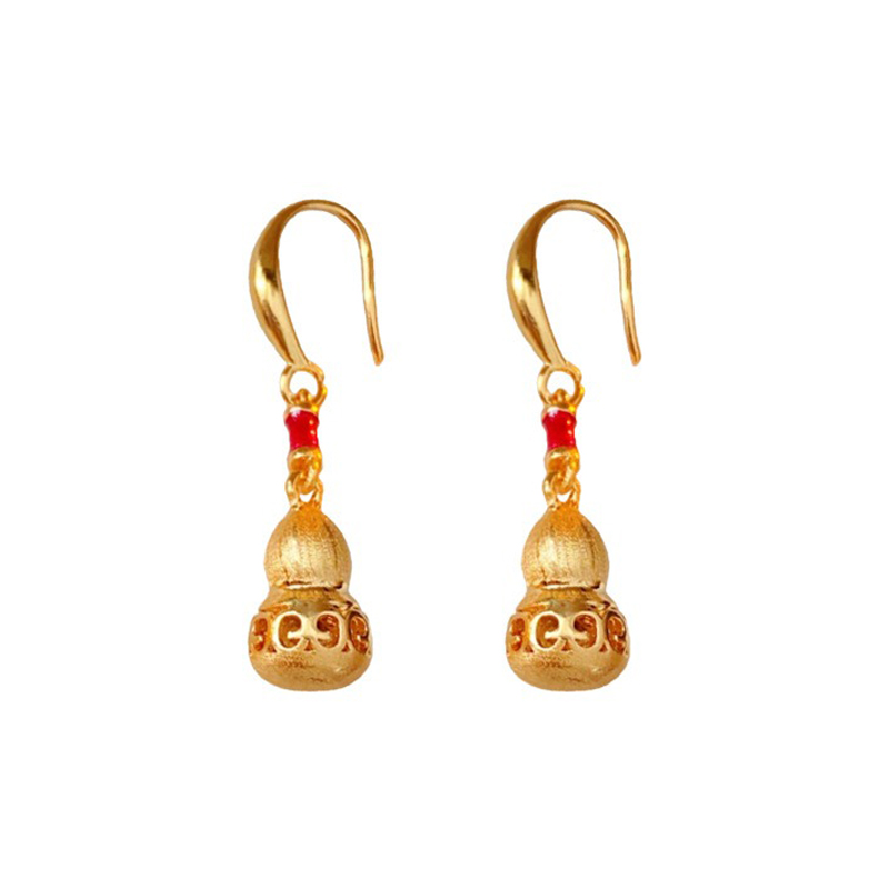 • The design begins with a graceful ear hook, leading to a red bead connector that adds a subtle pop of color and vitality. Suspended below is the earring’s centerpiece—a hollow gourd intricately carved at the base. This symbolic element not only enhances visual interest but also represents auspicious wishes for health, happiness, and wealth, making these earrings a meaningful token of good fortune.