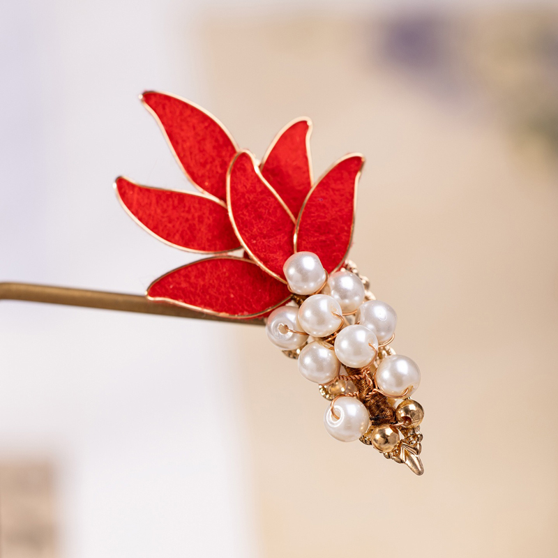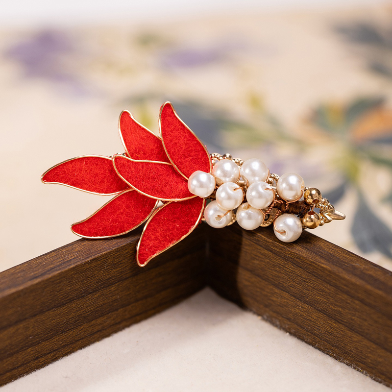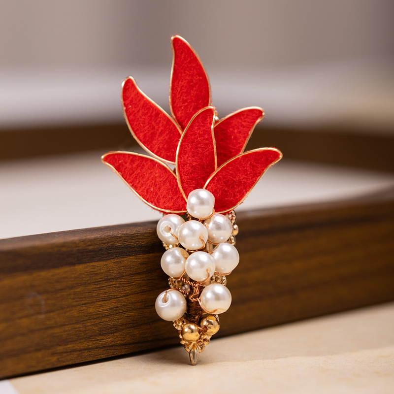 - Crafted from soft velvet fabric, faux pearls, and alloy components, the hair clip presents a rich contrast of textures and colors. The vivid red tones and lustrous pearls create a striking yet harmonious look, perfectly suited for New Year celebrations and other joyful occasions.