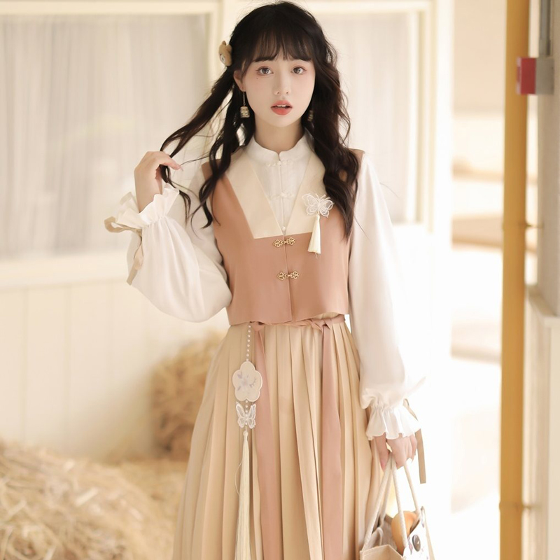 The Butterfly Breeze Hanfu set beautifully blends traditional Hanfu inspiration with modern casual fashion. Designed as a three-piece ensemble consisting of a vest and an integrated dress, this outfit offers both elegance and practicality for everyday wear. Delicate butterfly elements are subtly incorporated throughout the design, adding a lively and graceful charm that reflects the lightness of spring.