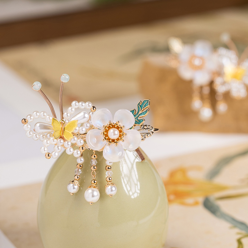 - The most striking detail of this clip lies in its layered butterfly motif. A fully formed butterfly made entirely of luminous faux pearl beads sits gracefully atop a smaller, translucent pale yellow butterfly. Together, they hover above the plum blossom base, forming a full and rounded main body that draws the eye with every turn of the head.