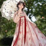 Drawing inspiration from the elegant and expressive style of the Tang Dynasty, this two-piece Hanfu set blends a classic round-collar top with a flowing skirt, creating a look that is both graceful and vibrant. Dominated by lively red tones, it captures the warmth and charm of spring, making it an excellent choice for daily wear. The design balances traditional structure with a playful, youthful aesthetic, perfect for those seeking a fresh interpretation of historical fashion.