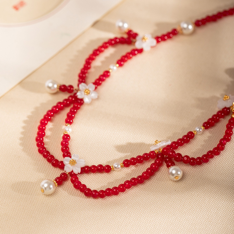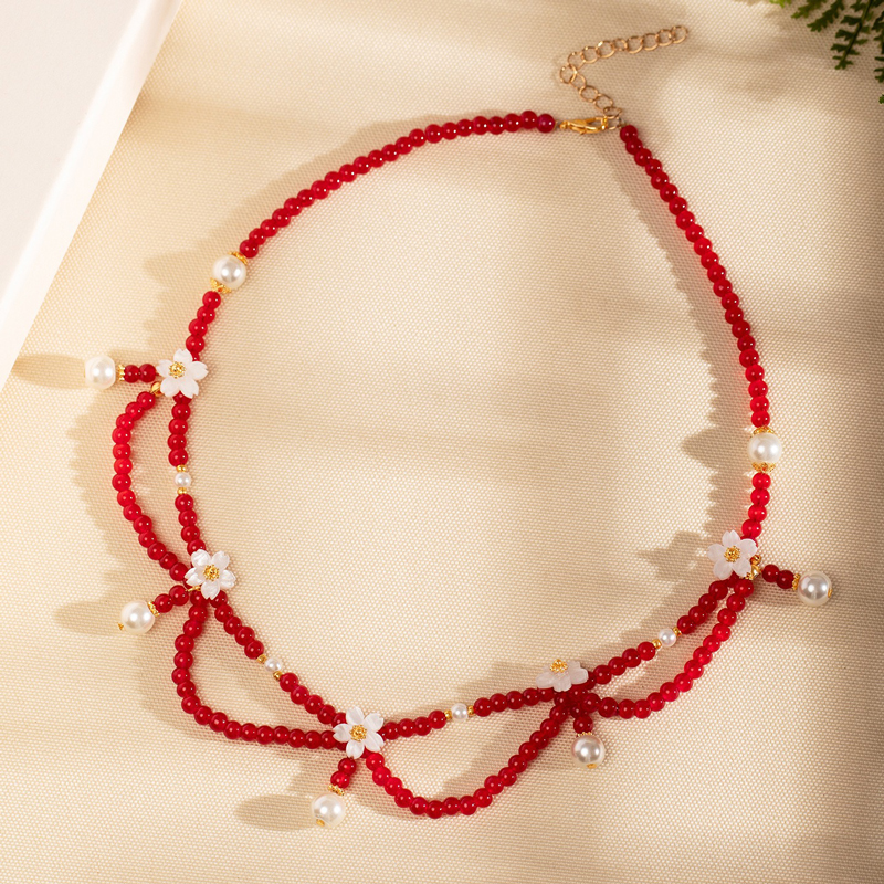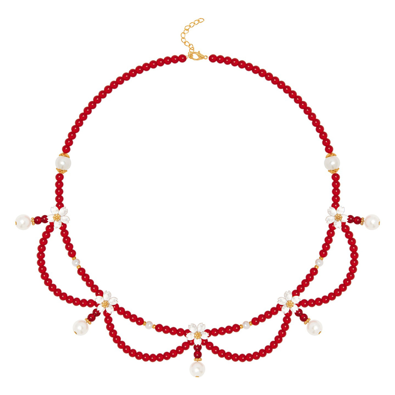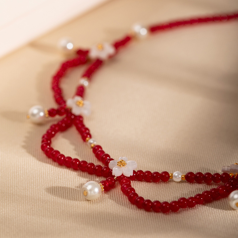 - Interwoven among the red pearls are white pearls and petite white resin flowers, creating a harmonious contrast that softens the overall look. The interplay between red and white represents balance and purity, giving the necklace an elegant rhythm reminiscent of blooming plum blossoms in early spring. Each detail is thoughtfully arranged to bring a sense of natural flow and feminine grace.