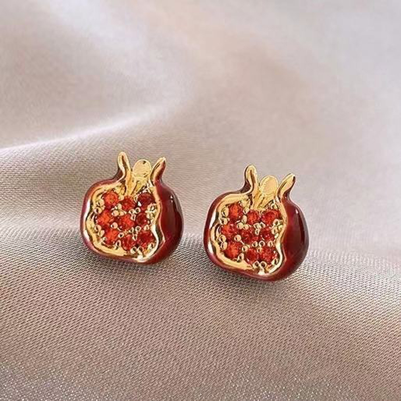 - The design finds its inspiration in the pomegranate, a traditional symbol of abundance and prosperity. Each earring is meticulously crafted from a durable alloy base and adorned with shimmering zircons that catch the light from every angle. Measuring approximately 1 cm in length, these studs offer a subtle yet impactful presence that is comfortable for all-day wear.