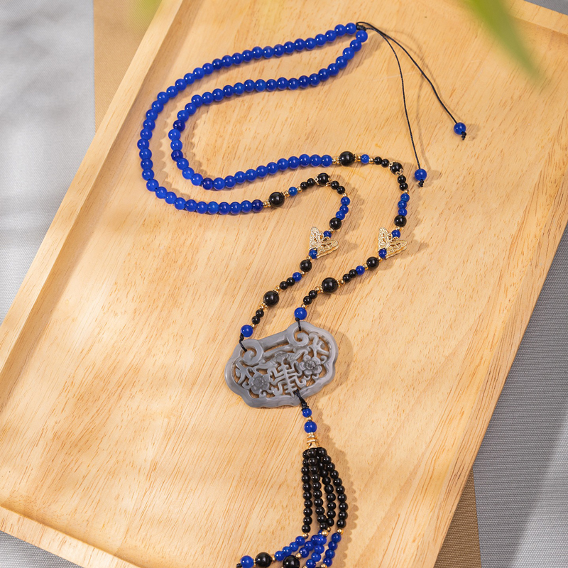 - The necklace features predominantly deep blue pearls accented with black pearls and elegant alloy components, forming a refined arrangement along the strand. At its center hangs a grey resin pendant carved in the form of a traditional jade-style plaque, adding cultural symbolism and enhancing the overall sense of heritage. The extended tassel cascade adds fluidity and visual drama.