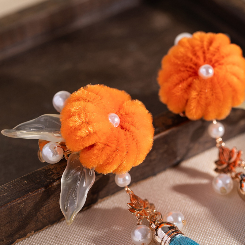 Fairy Pumpkin, a whimsical Hanfu hair clip that blends playful elegance with classical aesthetics. Highlighted by its delightful pumpkin motif and soft, delicate textures, this accessory brings a bright, lively touch to traditional styling. Whether worn for festivals, photoshoots, or everyday cultural fashion, it adds color, character, and charm to any Hanfu ensemble.