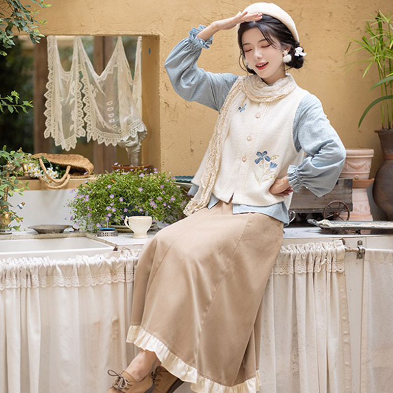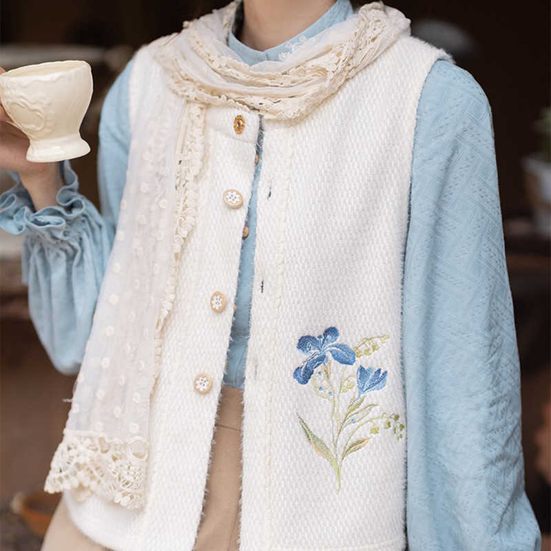 - Beneath the vest lies a light blue high-collar shirt, refined in both form and detail. At the neckline, a tiny iris embroidery blooms quietly, adding a touch of charm and sophistication. The puffed flower-bud sleeves bring playfulness and youthfulness to the look, subtly softening the overall silhouette. This top layer combines warmth with elegance, making it both functional and delightful for winter days.