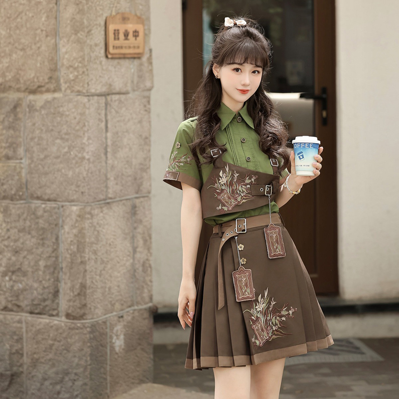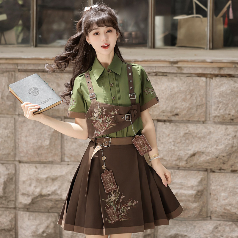 Inspired by the timeless elegance of traditional Hanfu, the Forest Poise set blends classic elements with a modern, structured silhouette. This two-piece outfit consists of a shirt and a short skirt, designed to reflect both cultural heritage and contemporary fashion. With its refined tailoring and nature-inspired palette, it offers a unique balance between softness and strength, making it a perfect choice for spring daily wear.