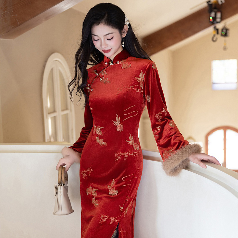 Retro-inspired qipao designed for women who cherish auspicious symbolism and timeless Chinese elegance. Draped in a vibrant red hue and adorned with meaningful koi motifs, this dress blends traditional charm with a festive spirit, making it an ideal choice for winter days and holiday celebrations. Its warm texture and graceful silhouette offer both beauty and comfort.