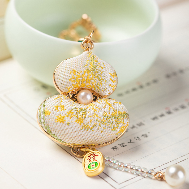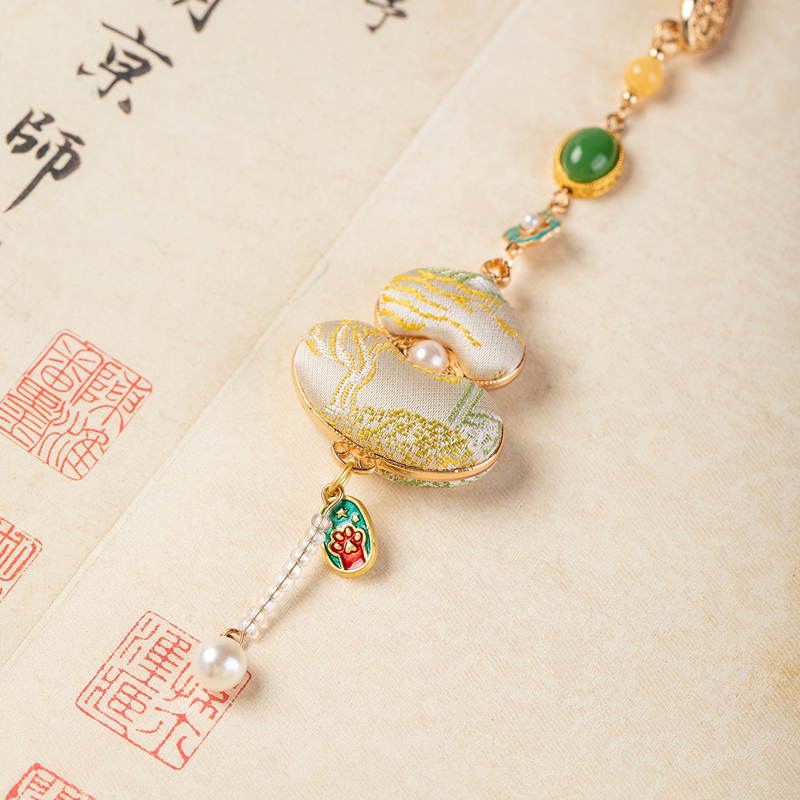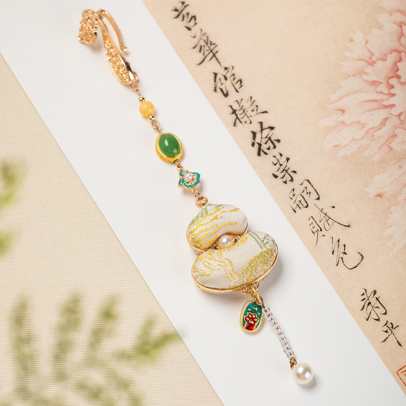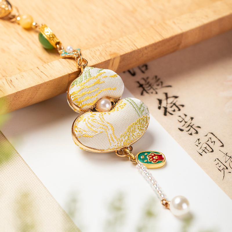 - The design begins with an alloy hook shaped like a jade ruyi, symbolizing good fortune. Below it, a soft light-yellow pearl and a deep green gemstone create a gentle color transition. The centerpiece features a full, rounded gourd crafted from Song brocade, symbolizing prosperity and blessings. Beneath the gourd hangs a small charm engraved with the character “發,” representing wealth and success, completing the Fortune Gourd as a piece rich in cultural meaning and elegant appeal.