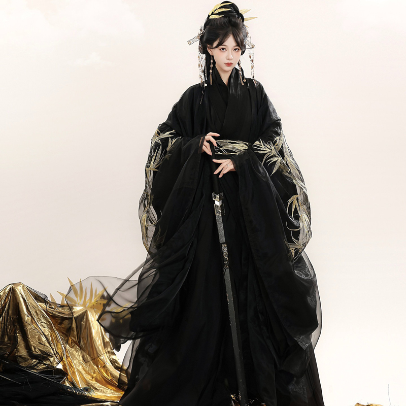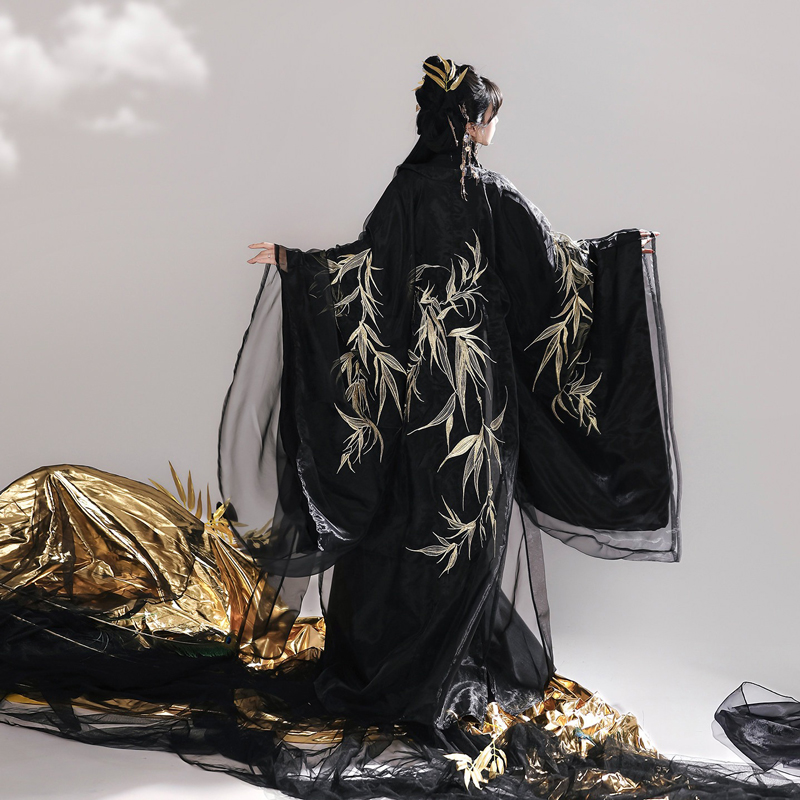 - The outermost layer is a masterpiece of craftsmanship, fashioned from a lightweight, breathable fabric that flows elegantly with every step. This sheer tunic is lavishly adorned with elaborate golden bamboo leaf embroidery, adding a unique and luxurious charm to the dark silhouette. The bamboo—a symbol of integrity and resilience—gleams against the black fabric, offering a sophisticated contrast that elevates the entire outfit to a work of wearable art.