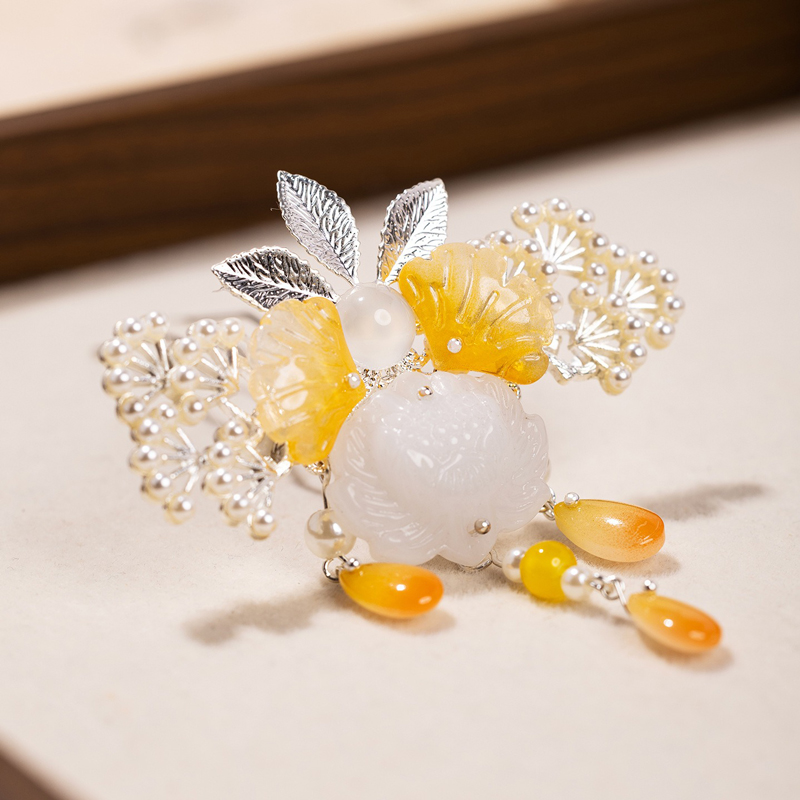 - Overall, Ginkgo Hairpin is a masterpiece of traditional charm and refined beauty, ideal for pairing with Hanfu or Qipao in coordinating hues. Whether styled in an elaborate updo or a simple bun, this hairpin enhances any hairstyle with effortless grace. Perfect for festivals, cultural performances, or elegant gatherings, it embodies the essence of classical femininity and poetic sophistication.