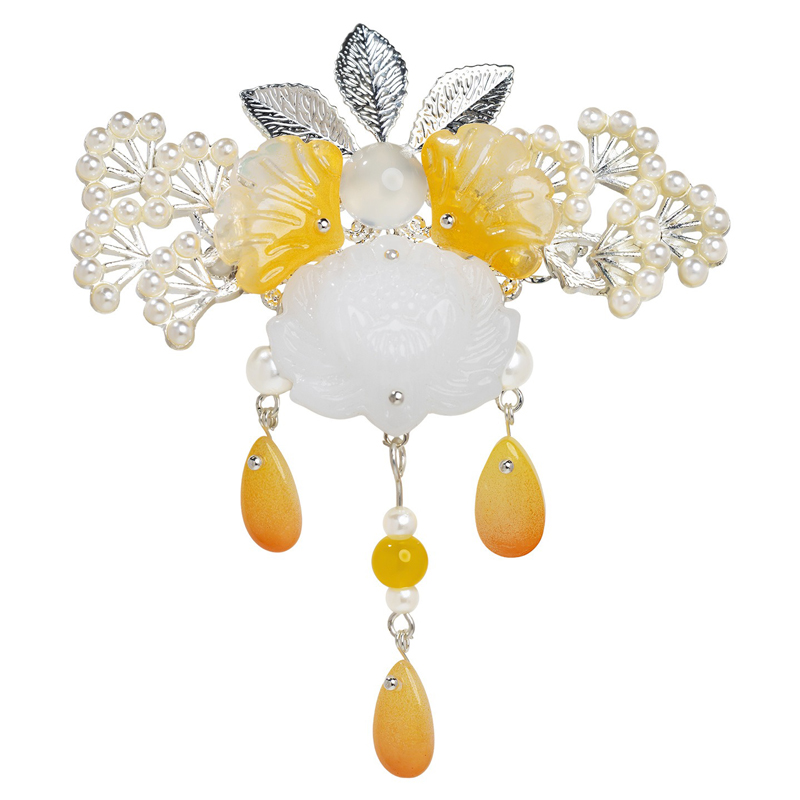 - At the heart of Ginkgo Hairpin lies its ginkgo and coronet-inspired design, symbolizing longevity, harmony, and prosperity. Measuring approximately 7.5 cm in width with a 7 cm pin, this piece balances presence and delicacy with ease. The harmonious combination of artificial pearls, resin, and alloy gives the hairpin both durability and a luxurious texture, making it a standout accessory for traditional ensembles.