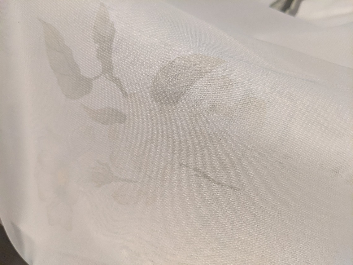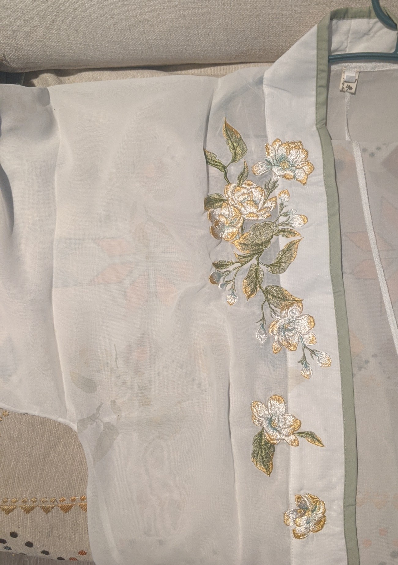 Flower embroidery was bigger and more yellow than pictured. It also has shimmery gold outline. Colour was very white and not the soft/off white. There was also faint print
