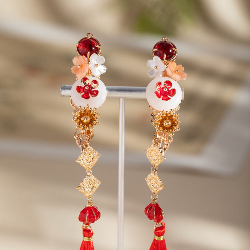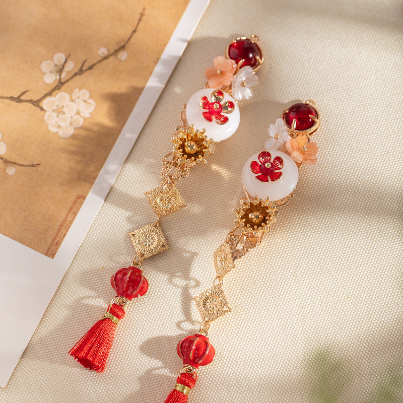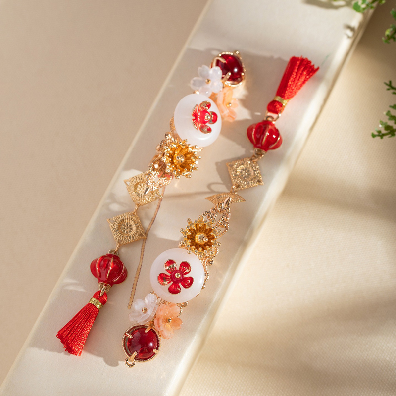 - In terms of dimensions, each hair clip is perfectly sized for visual impact, measuring approximately 8 cm in length and 6 cm in width. The structure features a sturdy alloy base adorned with a sophisticated arrangement of red gemstones, delicate flowers, and intricately carved alloy components. This rich combination of elements is further enhanced by a graceful tassel featuring a miniature red lantern, creating a dense and festive Chinese New Year atmosphere.