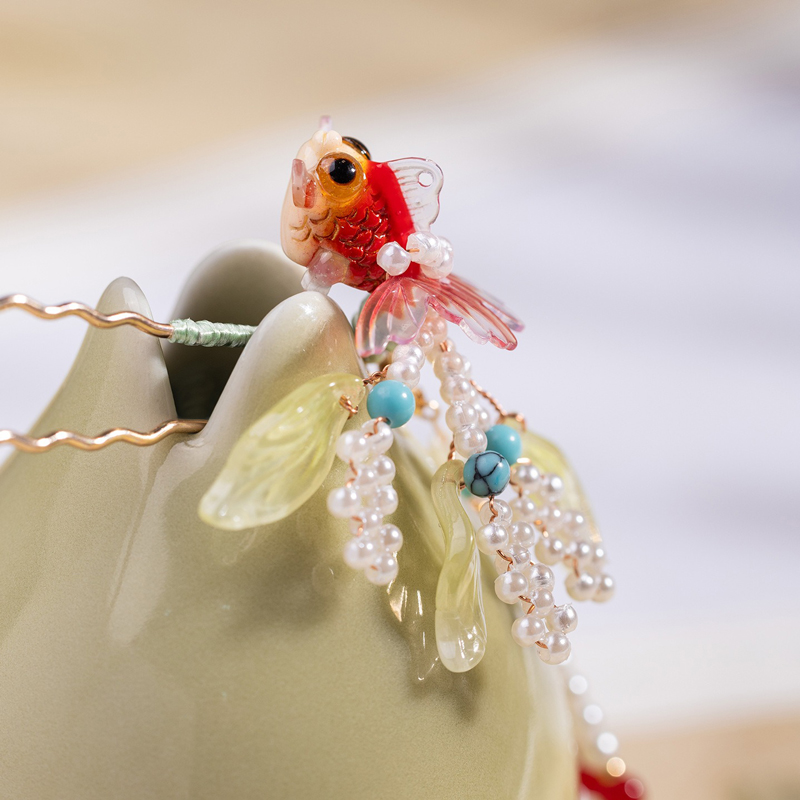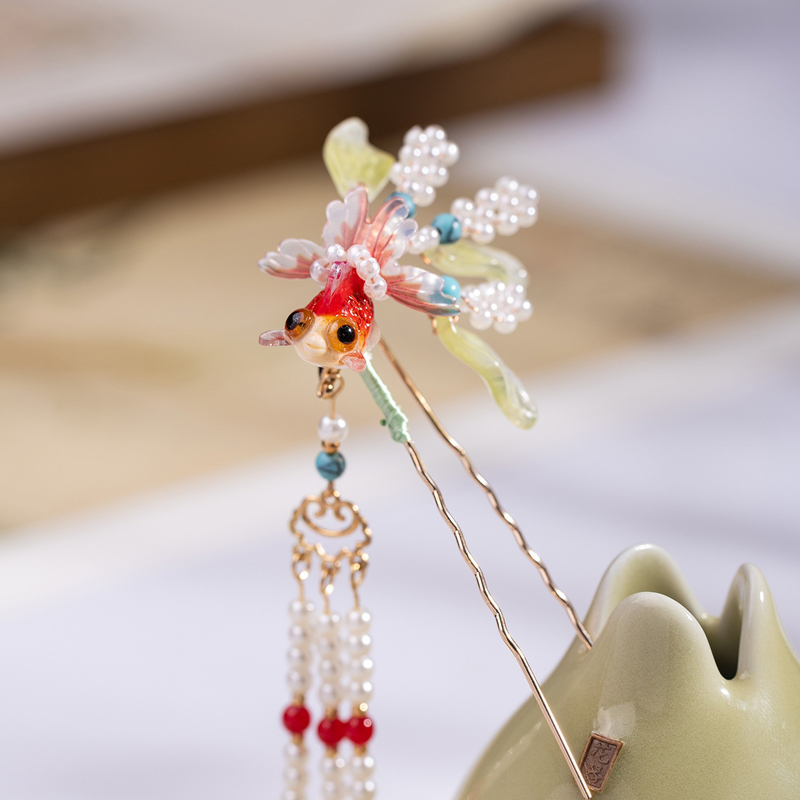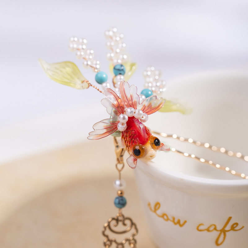 - The hairpin stem is crafted from alloy, providing durability and a polished metallic finish. At the center of the design sits a beautifully shaped goldfish motif, formed through the artistic combination of resin and artificial pearls. These materials work together to create a vivid and delicate appearance that highlights the graceful inspiration behind the piece.