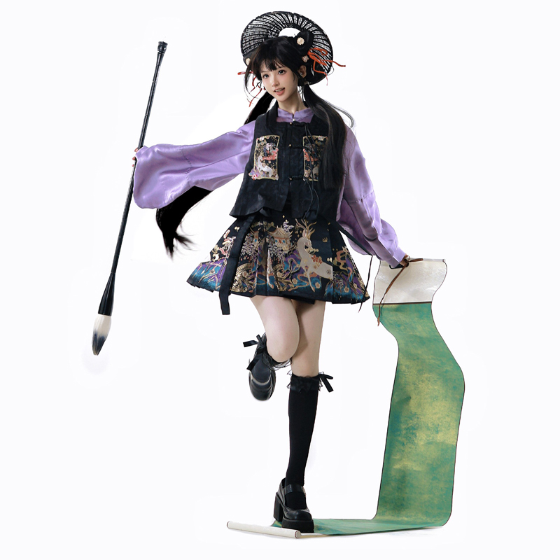 Inspired by the elegant style of the Ming Dynasty, the Luminous Deer Hanfu set blends traditional cultural elements with a playful modern silhouette. This three-piece ensemble consists of a black vest, a purple shirt, and a short skirt, creating a stylish yet historically inspired look. The design incorporates artistic motifs from the famous Nine-colored Deer mural in Dunhuang’s Mogao Cave 257, symbolizing good fortune and auspicious blessings. With its unique cultural story and fashionable structure, this Hanfu set is both eye-catching and meaningful.