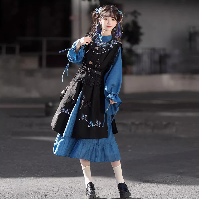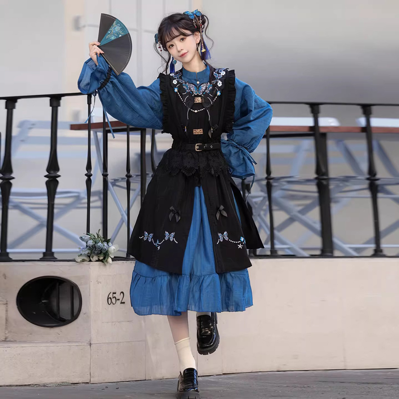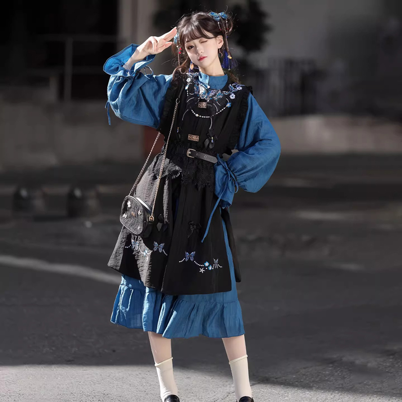 - The long Bijia vest features a black base inspired by Ming Dynasty garment structures. It is fastened with traditional Zi Mu buckles, adding both historical authenticity and visual interest. Decorative butterfly embroidery across the vest enhances the theme of the design, bringing vitality and artistic refinement while contrasting beautifully with the blue dress beneath.