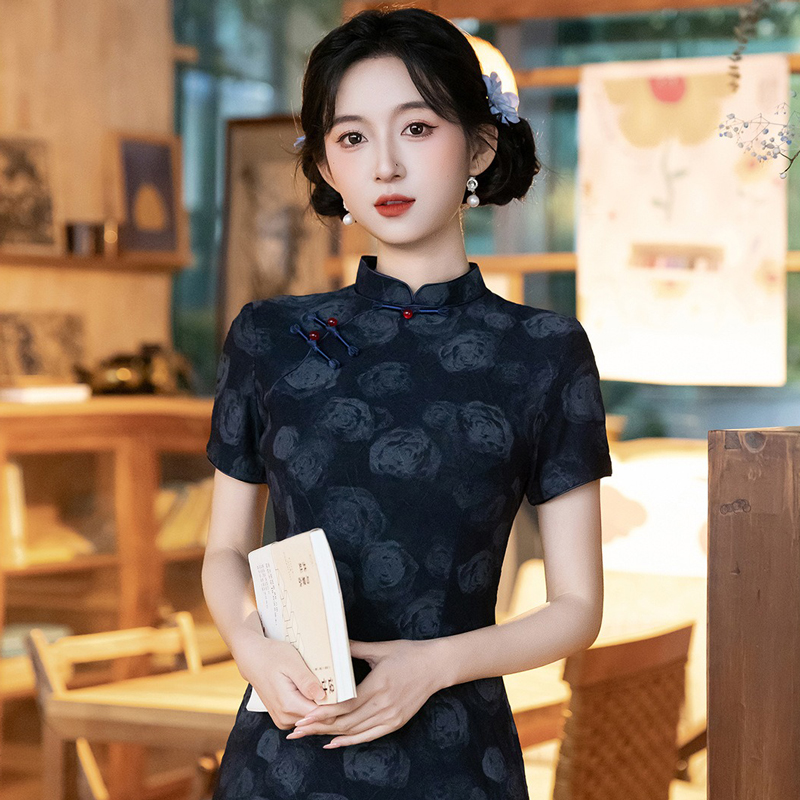 This vintage-inspired qipao embodies understated elegance with a touch of romantic charm. Designed in a deep navy hue and adorned with delicate rose patterns, it creates a refined and graceful aesthetic. Perfect for both everyday wear and semi-formal occasions, this piece blends classic tradition with modern sophistication, making it a versatile addition to any wardrobe.