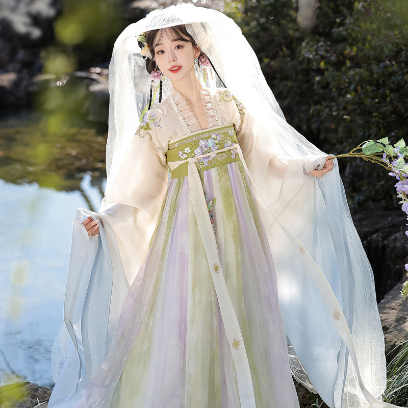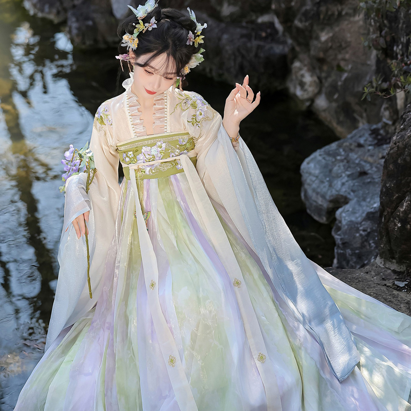 Inspired by the refined elegance of the Tang Dynasty, this two-piece Hanfu set combines a flowing large-sleeved outer shirt with a graceful skirt, presenting a harmonious balance of tradition and soft modern charm. The refreshing blend of green and purple tones evokes the vitality of spring landscapes, making it an ideal choice for daily wear. Light, airy fabrics and fluid silhouettes create a look that feels both ethereal and effortlessly wearable.