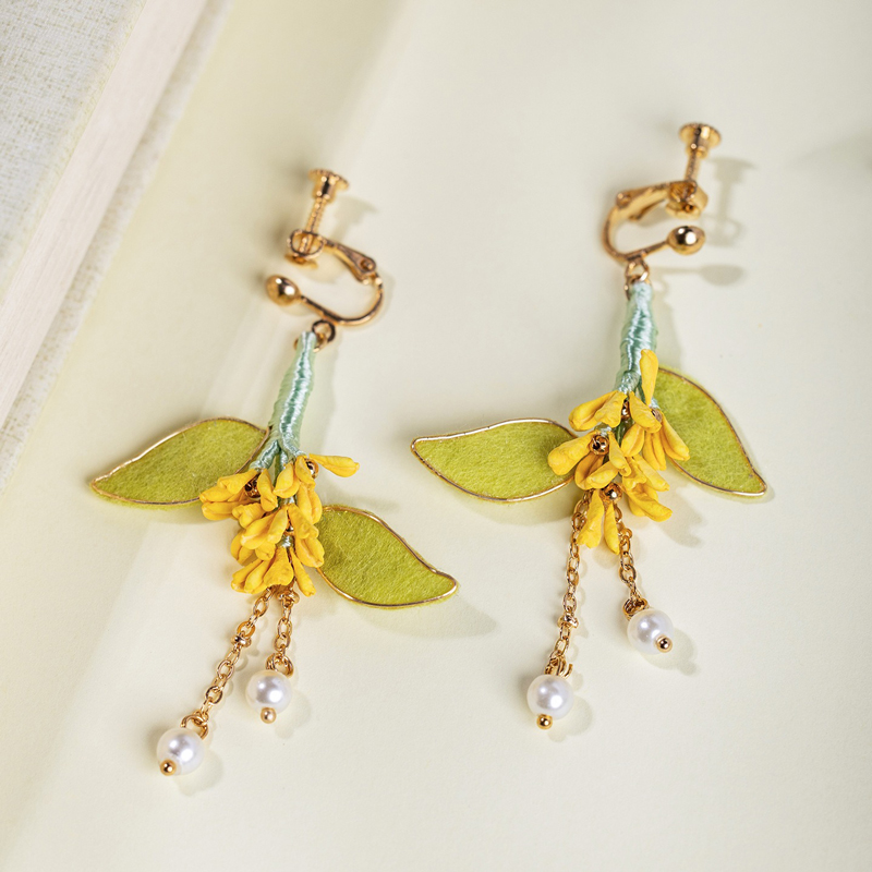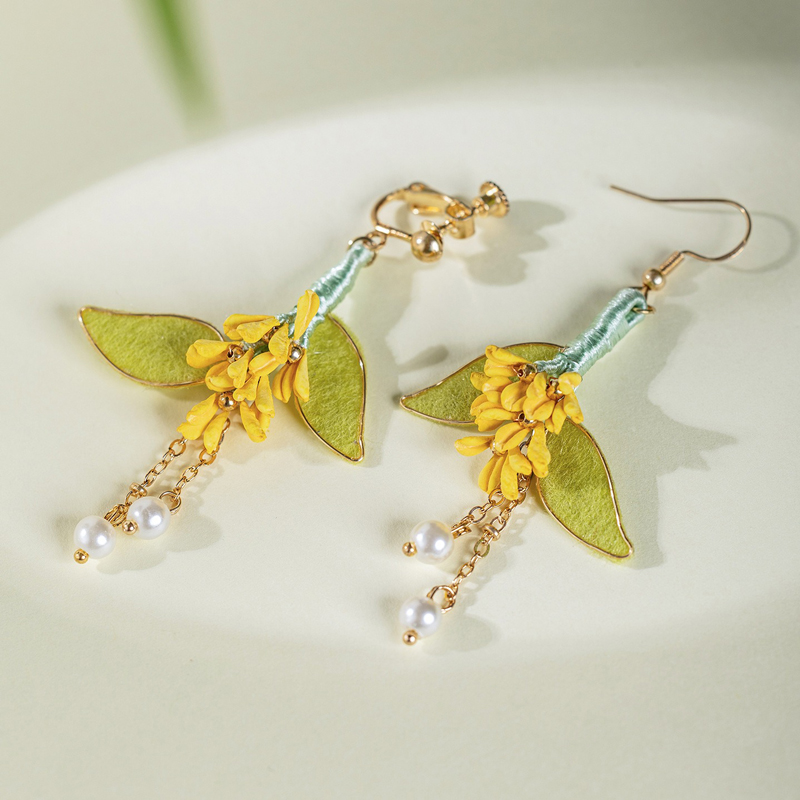 - The centerpiece of Osmanthus Bloom features green velvet leaves and osmanthus-inspired floral cores, accented by two softly glowing artificial pearls that hang like tiny tassels. The design captures the moment when autumn flowers gently sway in the breeze, infusing the piece with quiet movement and natural rhythm. Perfect for pairing with similarly toned Hanfu or Qipao, these earrings serve as both a finishing touch and a focal point — a poetic expression of grace, femininity, and timeless oriental beauty.