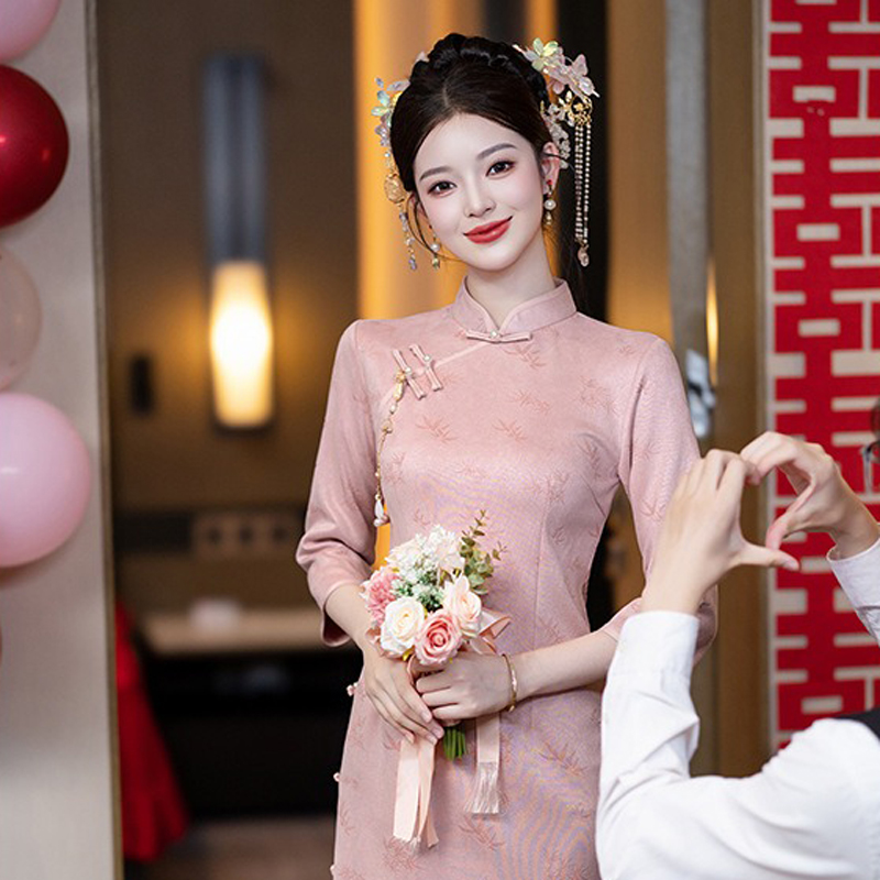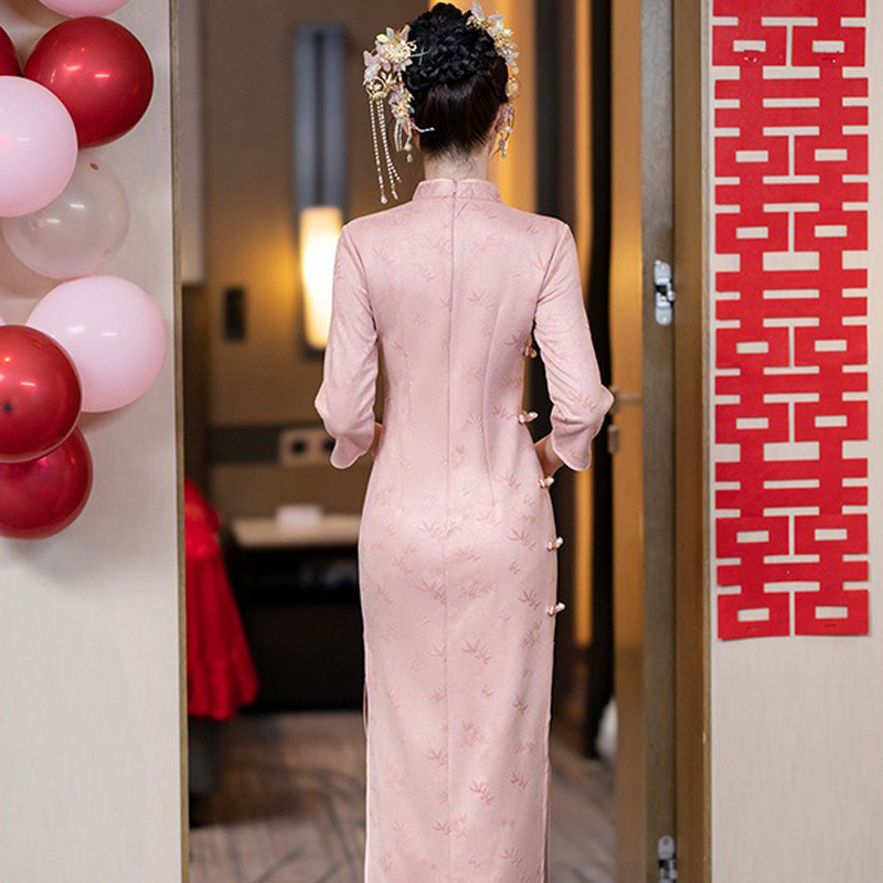 - The primary color of this qipao is a warm, elegant pink, symbolizing softness and romance. Bamboo leaves are used as the main decorative element, scattered subtly across the garment. In Chinese culture, bamboo represents integrity, resilience, and grace, lending the dress a deeper cultural significance alongside its visual beauty.
