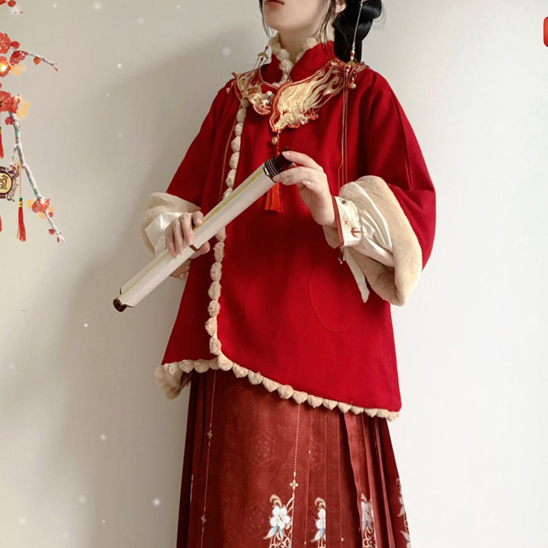 Step into the new season with a magnificent blend of tradition and regal elegance. This exquisite four-piece winter Hanfu set draws direct inspiration from the majestic styles of the Ming Dynasty, designed to make a powerful and graceful statement. Comprising a cloak, an inner garment, a skirt, and a cloud collar, the ensemble is meticulously crafted for those who appreciate deep cultural heritage without compromising on style. Its foundational theme, rich with symbolic meaning, is perfect for creating unforgettable moments during festive celebrations and special occasions.