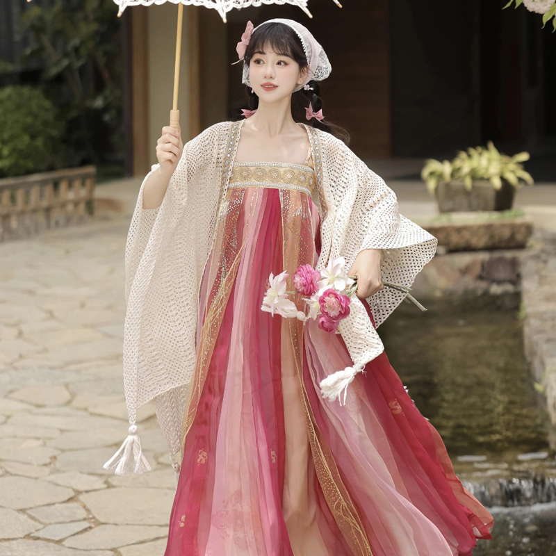 Blending the elegance of Tang Dynasty Hanfu with a relaxed vacation-inspired style, the Rosy Journey set offers a refreshing take on traditional fashion. This two-piece ensemble consists of a modernized Qixiong dress and a knitted outer cardigan, combining historical charm with contemporary practicality. Designed for effortless styling, it is perfect for those seeking a balance between cultural aesthetics and casual spring-summer wear.