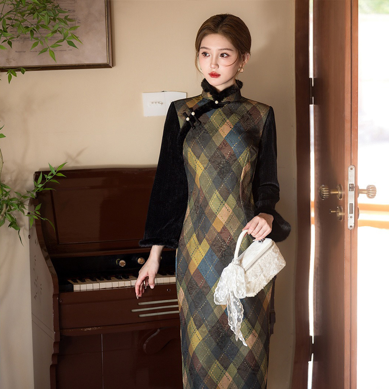 Refined retro-style qipao created for women who love understated elegance blended with modern visual flair. With its dark-toned palette and clean geometric motifs, this dress effortlessly bridges classical Chinese aesthetics and contemporary design language. Its warm, soft texture and elongated silhouette make it an excellent choice for winter wear, offering both comfort and quiet sophistication.