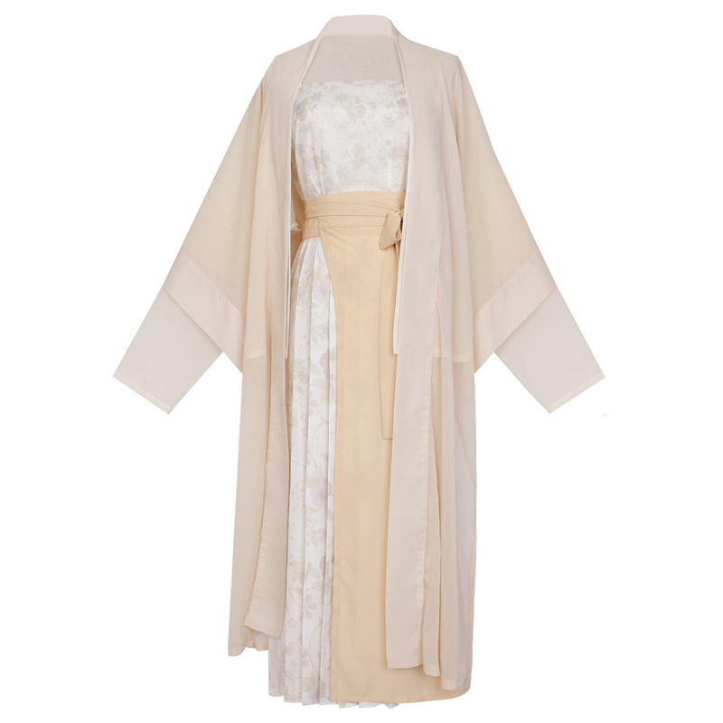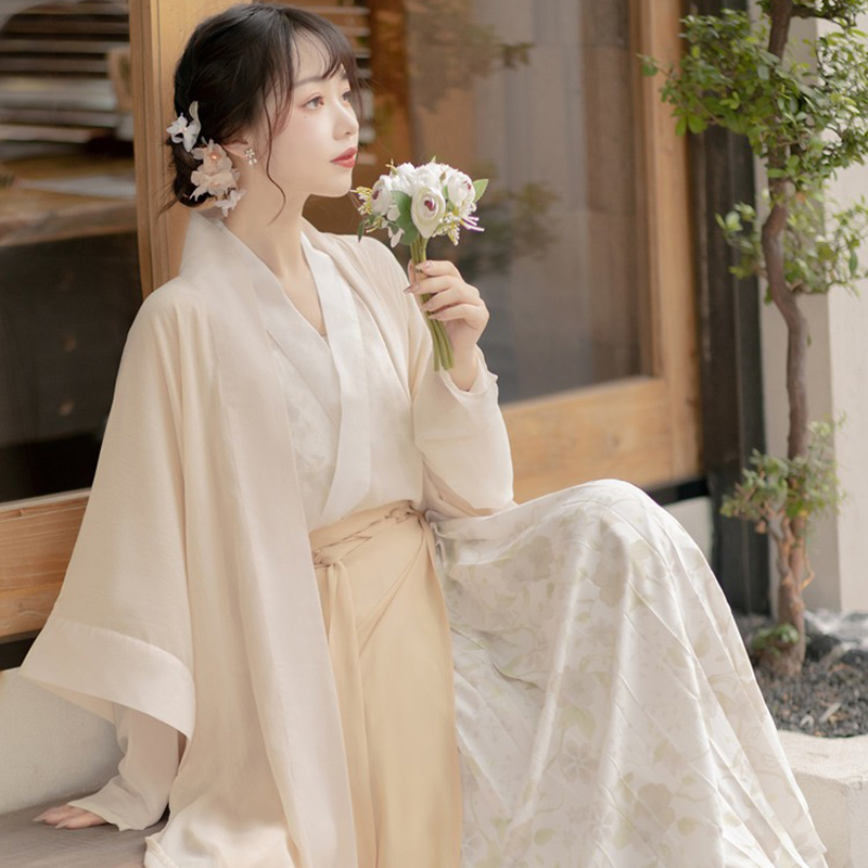 • This Hanfu set features a fresh and natural color palette, with beige as the dominant tone enhanced by subtle floral prints. The clean hues highlight the calm sophistication characteristic of Song-era clothing, while the gentle floral motifs introduce a touch of vitality and femininity. The overall design is light and harmonious, making Song Elegance an ideal choice for women who appreciate understated grace and cultural artistry.