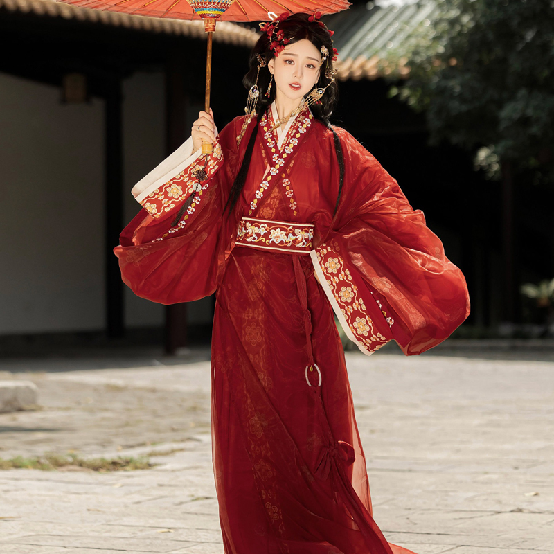 - The design philosophy of this attire is rooted in the boldness of vibrant red hues paired with timeless classical patterns. The striking color palette commands attention while maintaining a sense of regal sophistication, drawing inspiration from ancient aesthetics. Every detail, from the cut of the collar to the flow of the sleeves, pays homage to the rich cultural heritage of the Warring States, creating a look that is both powerful and graceful.